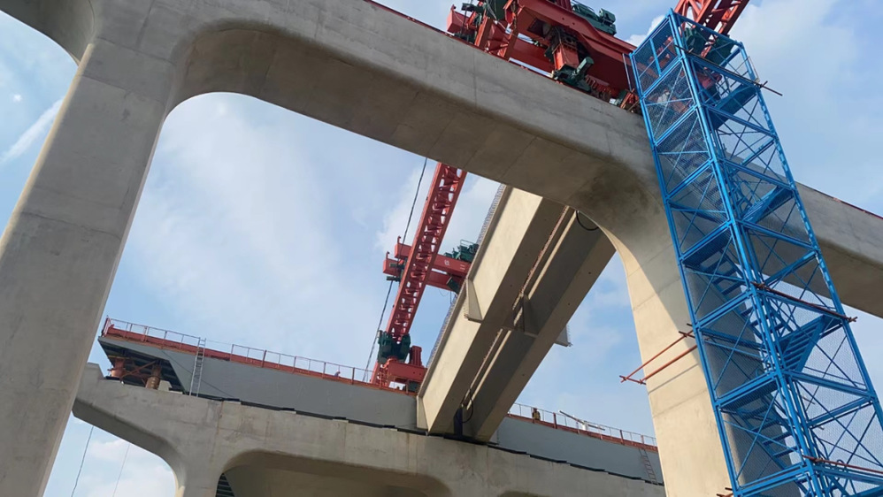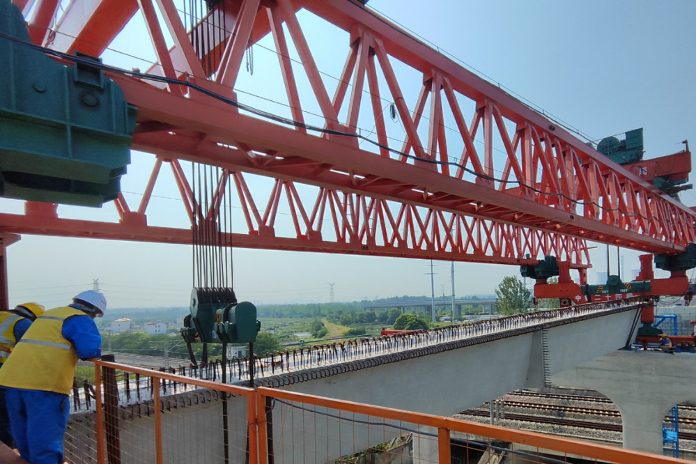 8月10日上午,運河路北延鐵路鄰跨順利完成架橋機過軌、首片箱梁架設施工任務,打響了跨鐵路箱梁架設施工第一槍。